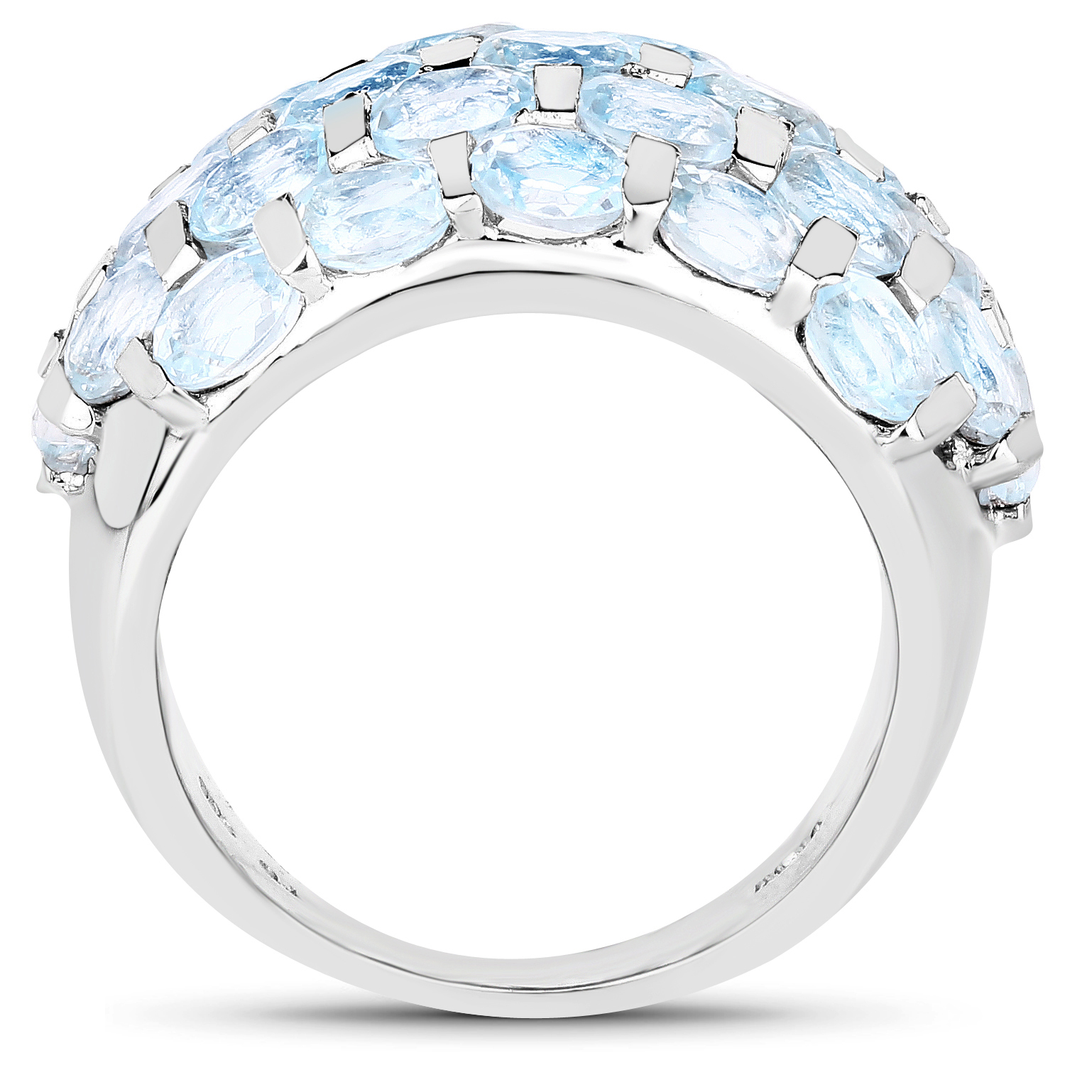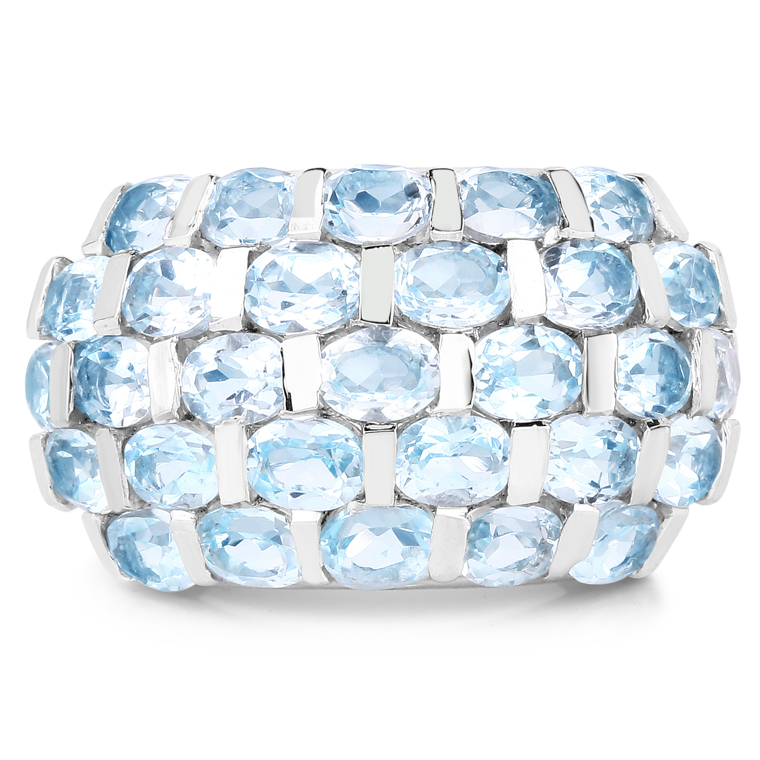 This ring features oval-cut sky blue topaz, each approximately 4x3mm, arranged in a wide, multi-row cluster across the top. The layout creates a continuous surface of soft blue color, with each stone contributing to a bright, reflective finish.