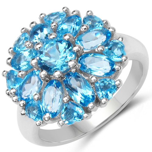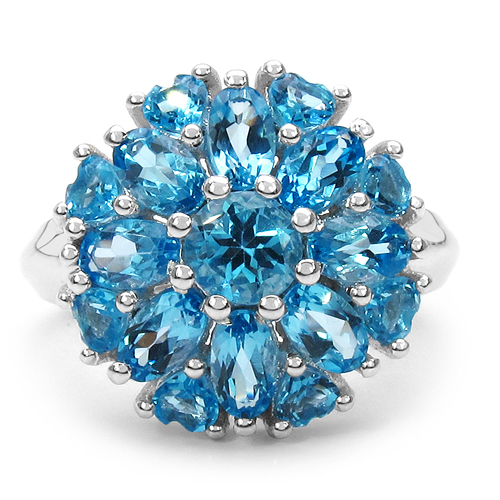 This ring features a combination of Swiss blue topaz in multiple shapes, including oval, heart, and round cuts. The mix of cuts creates a clustered design with varied light reflection, giving the surface a more dynamic and textured appearance.