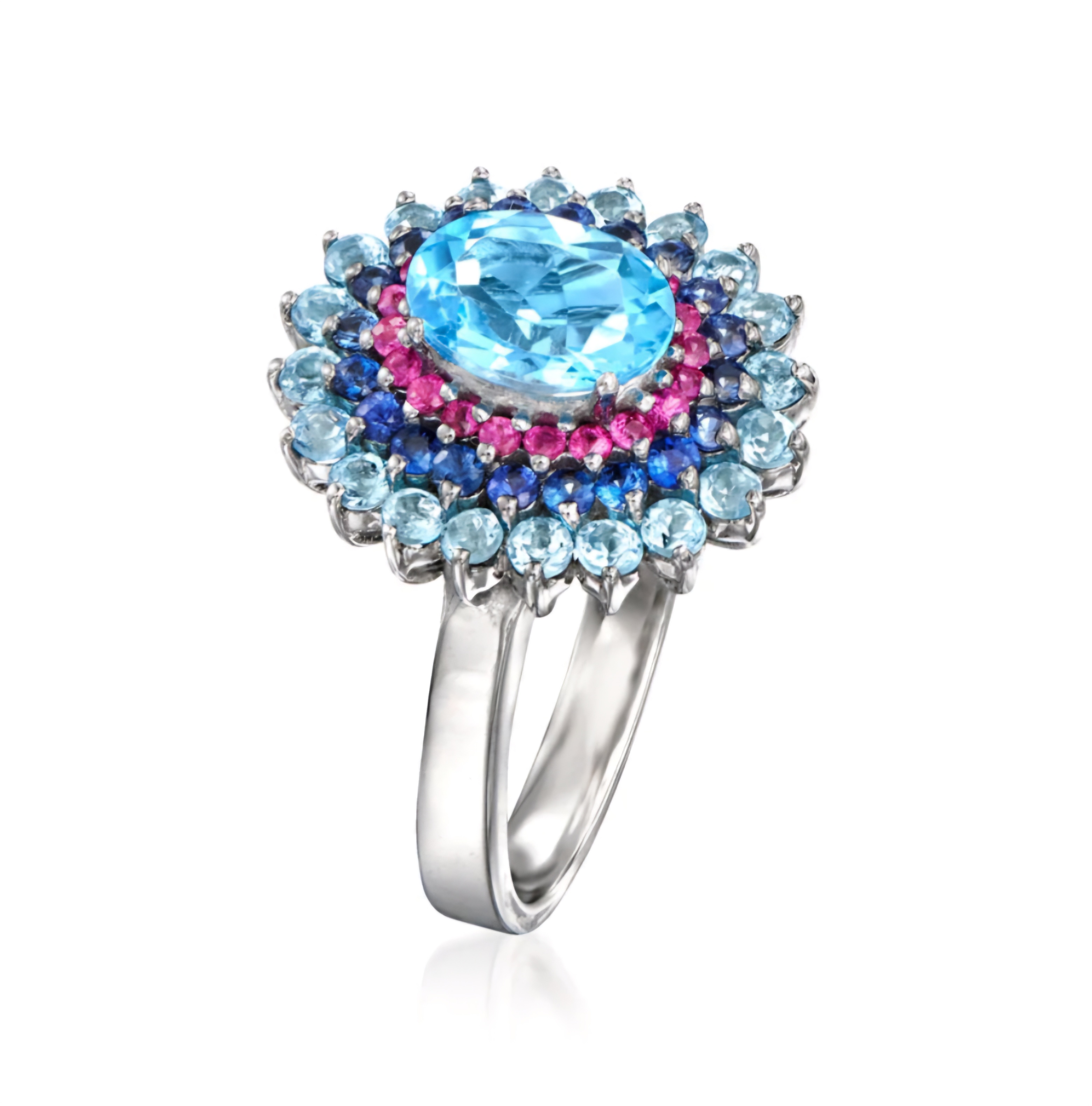 Elevate your style with this exquisite Swiss Blue Topaz, Pink Sapphire & Blue Sapphire Cluster Halo Ring in 14K White Gold 3.20ctw. Crafted with precision and attention to detail, this stunning piece features a cluster of vibrant gemstones set in a halo design. The combination of Swiss Blue Topaz, Pink Sapphire, and Blue Sapphire creates a mesmerizing display of color and brilliance. Perfect for special occasions or everyday wear, this ring is sure to turn heads and make a statement wherever you go.