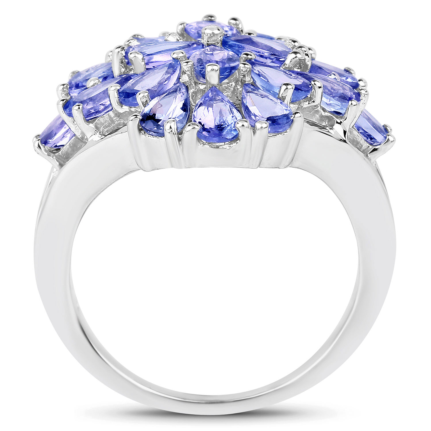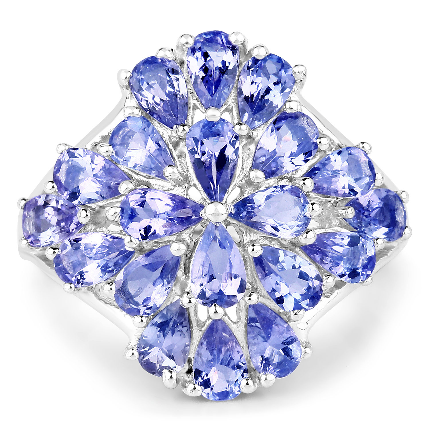 This ring features pear-cut tanzanite, each approximately 5x3mm, arranged in a radiating cluster that forms a bold, flower-like design. The layout creates a complete surface of color, with each stone angled to reflect light and enhance the natural brilliance of the tanzanite.