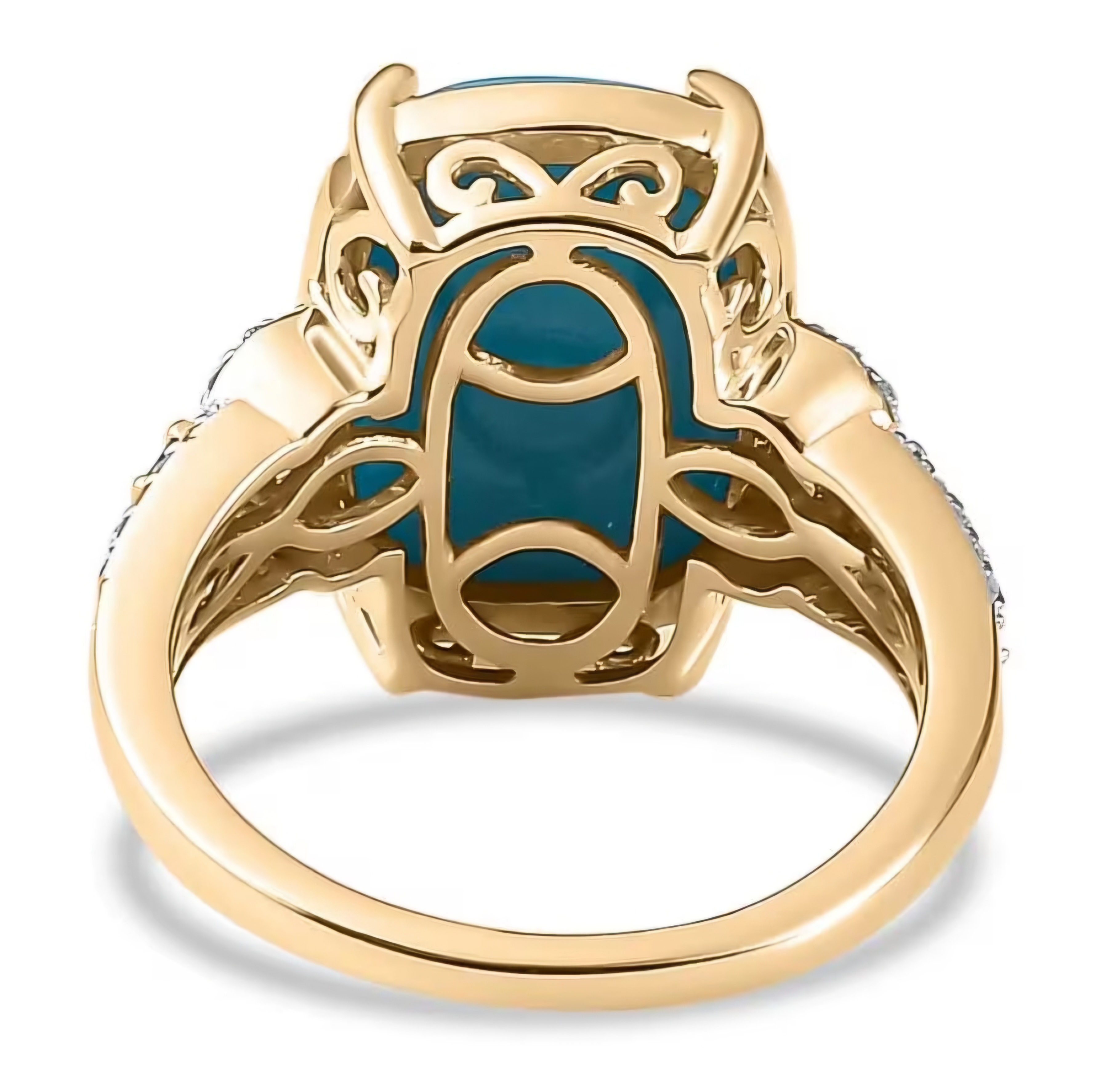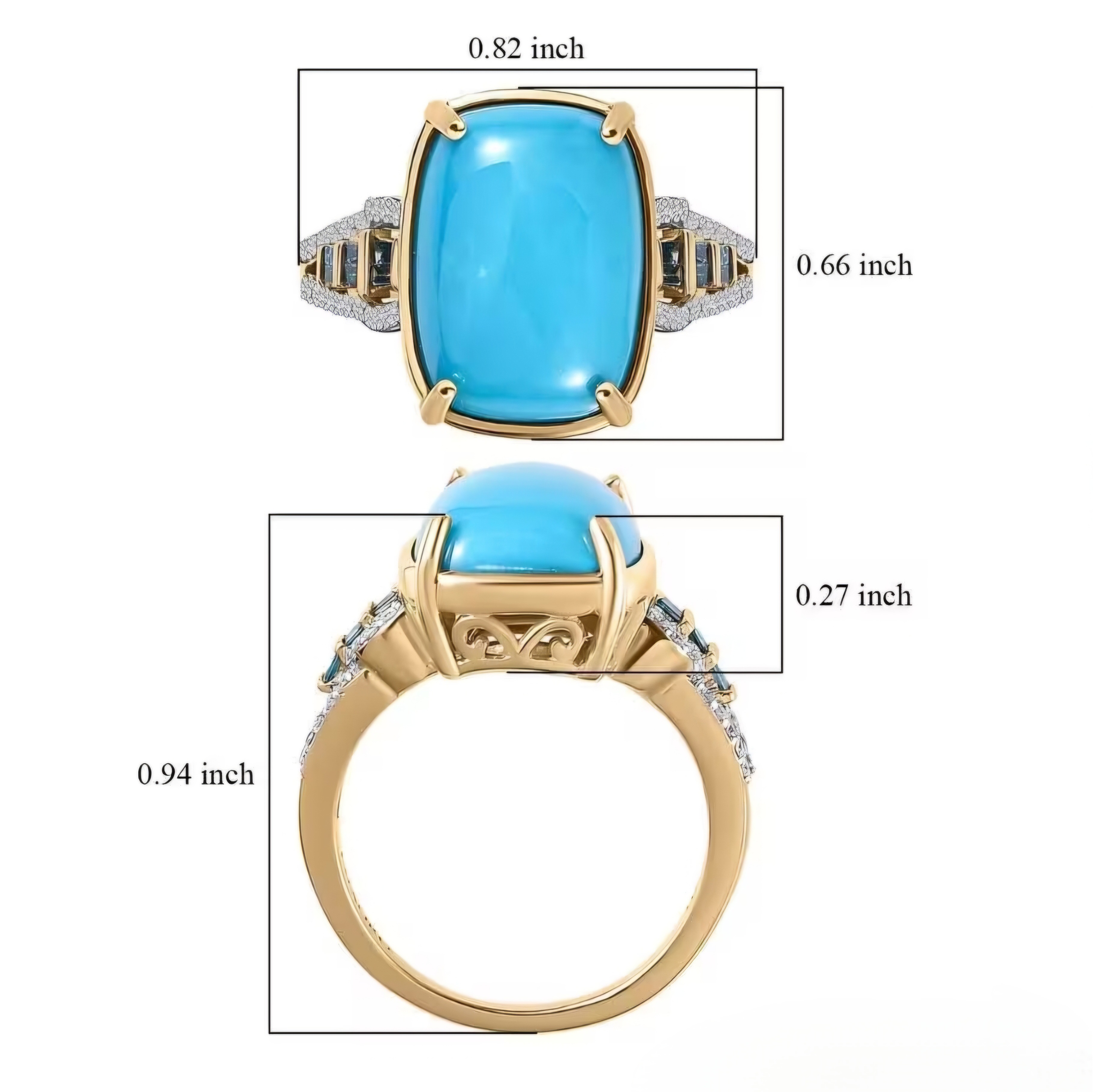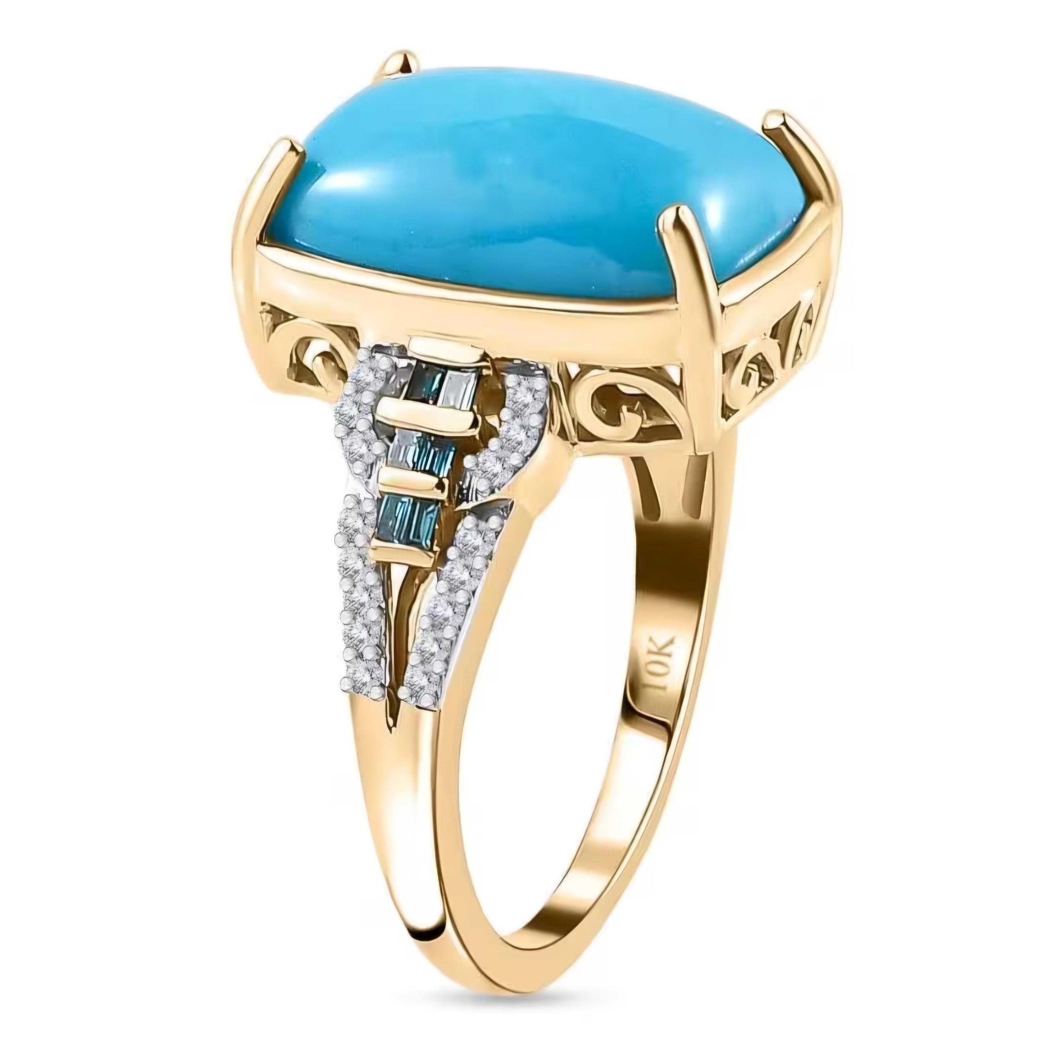 Elevate your jewelry collection with this stunning Turquoise, Blue & White Diamond Ring in Solid 10k Yellow Gold. Featuring a captivating 14x10mm natural Sleeping Beauty Mine cushion cut Turquoise center stone, complemented by 0.20ctw channel set baguette blue diamonds and a double row of round white diamonds down the shank sides, this ring is a true showstopper. Add a pop of color and sparkle to any outfit with this 5.50ctw statement piece.